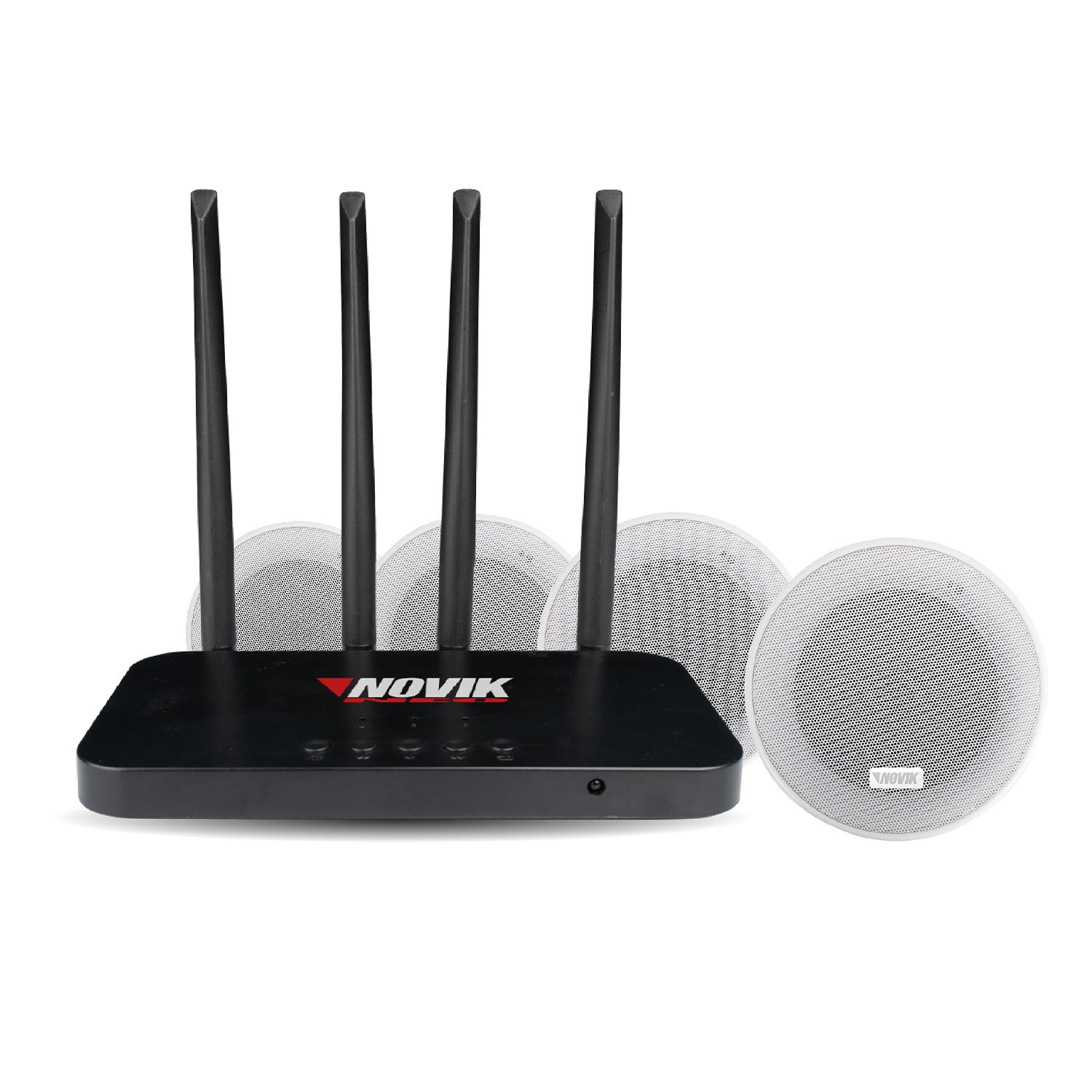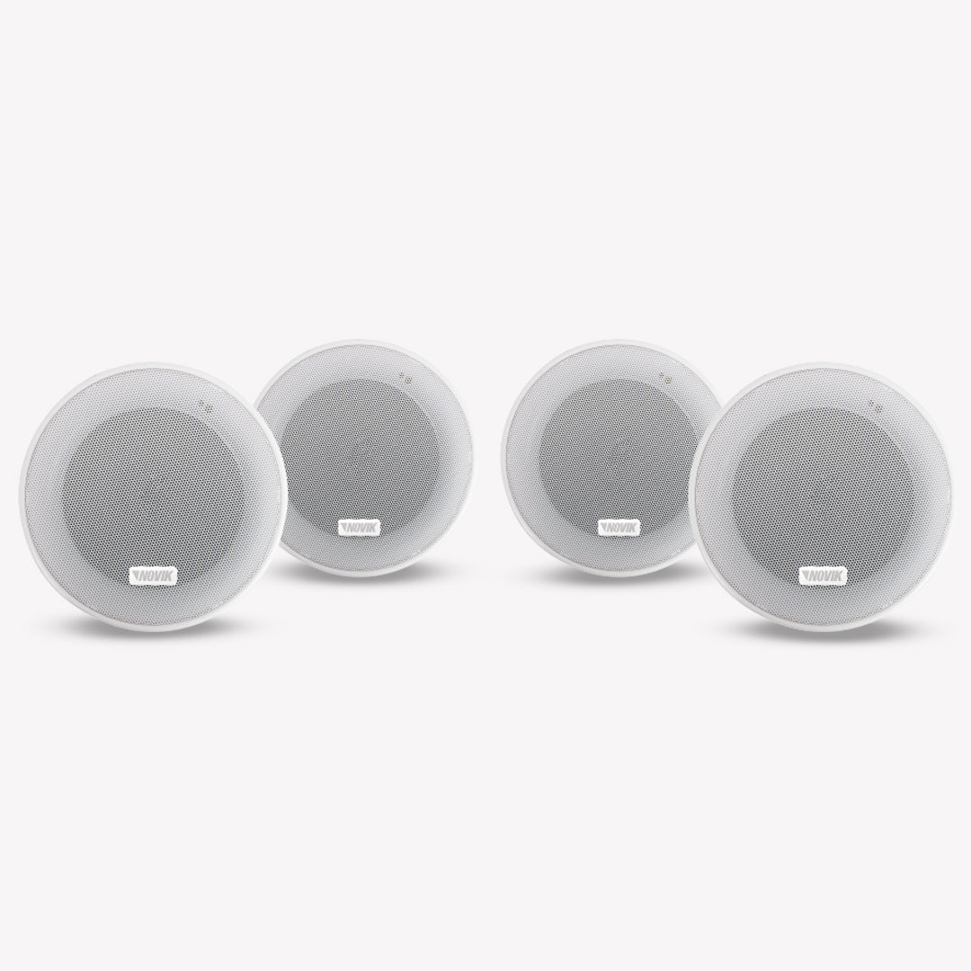 El Novik FREE SOUND es un sistema de audio inalámbrico para entornos comerciales que incluye un transmisor UHF y cuatro altavoces de techo de 20W, eliminando el cableado entre ellos para cubrir hasta 10,000 m². Ofrece conectividad vía Bluetooth 5.3, USB y entradas auxiliares, permitiendo un control total mediante un mando a distancia con ecualizador integrado para una instalación estética, rápida y eficiente.